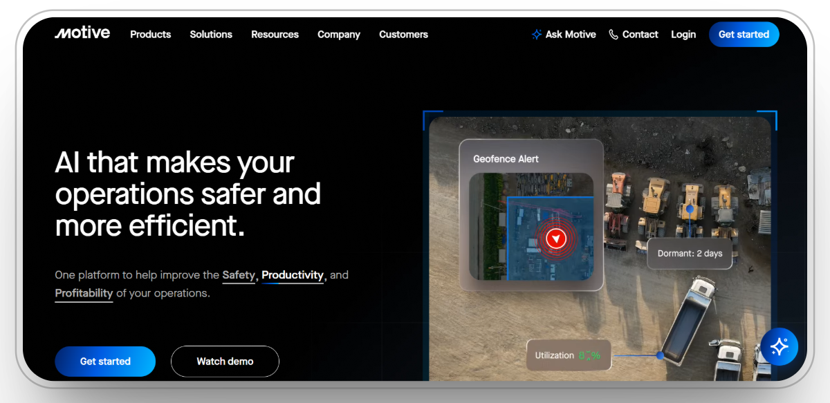 Choose Motive (formerly KeepTruckin) if: You need near real-time fleet tracking with advanced driver scoring, AI dashcams, and integrated compliance tools, designed for construction firms that need to optimize driver behavior and equipment health.