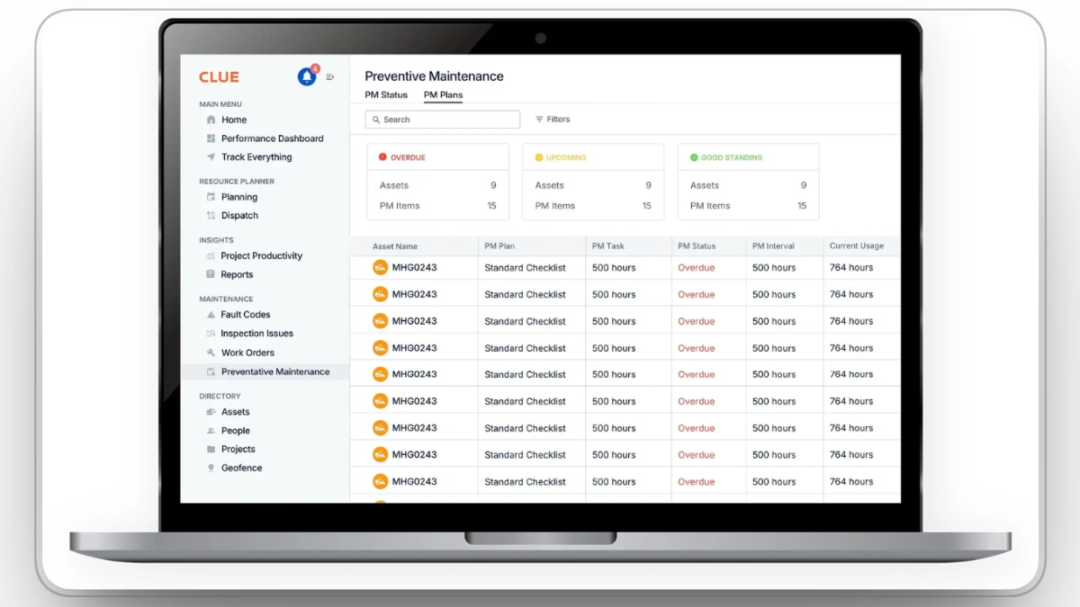 Advancing from reactive to preventive and predictive stages requires disciplined maintenance workflows. Clue automates preventive maintenance scheduling based on engine hours and service intervals, tracks work orders, and maintains asset history.