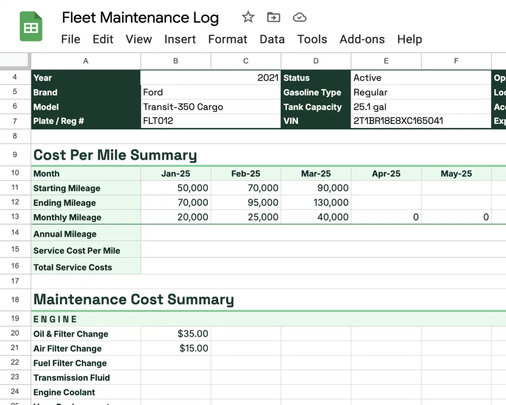 This free spreadsheet makes it easy to log vehicle details, track maintenance and calculate key metrics like total cost per mile — all in one place. Designed as a simple, user-friendly alternative to Excel, you can get started in seconds.